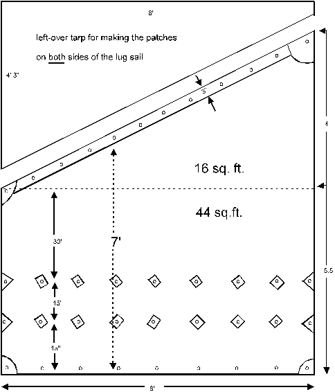 After the head is cut, a right triangle of material is left over.  The short leg of this triangle is 4.3".  From this material, for both sides, cut the reinforcement patches and glue them onto the four corners.  The four smaller, triangular patches go onto the luff and the leech.  The fourteen square patches are for the reef points.  These patches measure only 2"x2".  Altogether, 39 grommets are used in the sail.