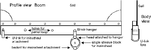 3.                  Attach a stainless steel block hanger at of the boom length aft.  The head of the single sheave block with head and becket is hung at this hanger.  The mainsheet is attached to the becket of the block.