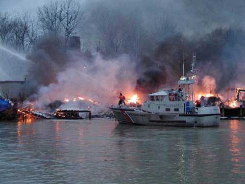 RUNAWAY TRAIN FIRE: ROCHESTER, New York (Dec. 23)--A 47-foot motor lifeboat and 55-foot Auxiliary boat from Station Rochester respond to a fire from a runaway train that exploded with three tank cars and 42 other cars on the edge of the Genesee River today. USCG Auxiliary photo by George R. Taylor