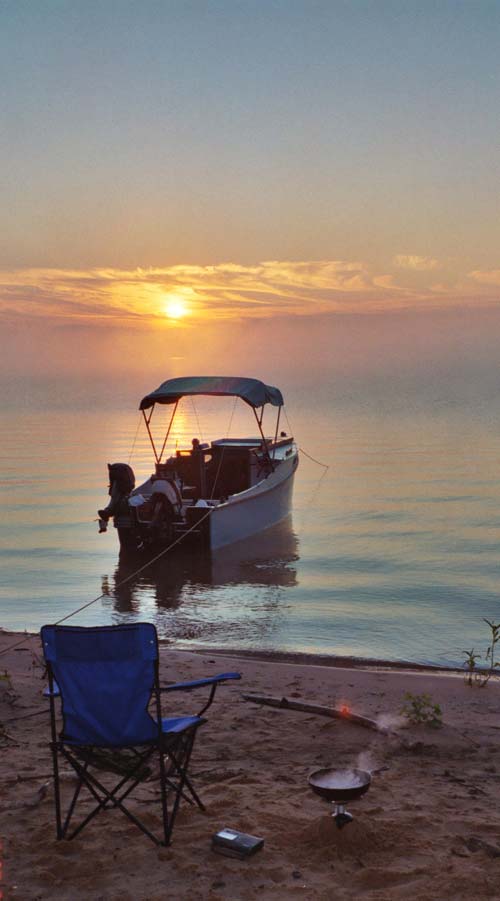 A nice sand beach, the AF4 securely moored, the sun riseing above the morning mist, a comfortable chair, and bacon frying in the skillet on the camp stove.