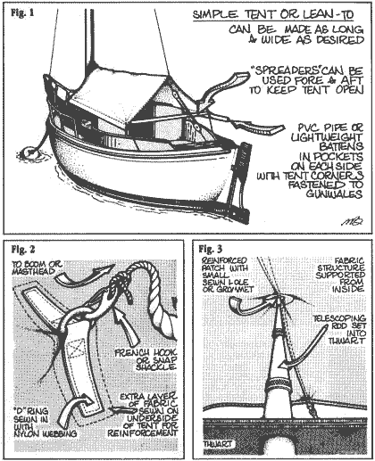 Options for framing and support of a fabric structure are limited only by the imagination. A ridgepole is the simplest support and does a creditable job (Fig 1). Ridgepoles usually run fore and aft down the centerline, although they can also be positioned on one side of a hull for a “lean-to” shelter. A boom is the classic ridgepole, but we’ve also used a 10-foot sculling oar supported by a forward tripod and a notch in the transom.