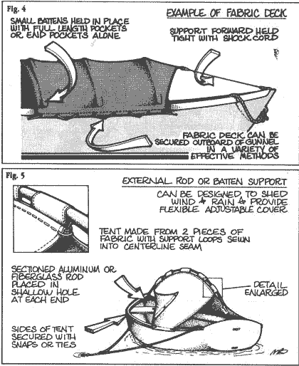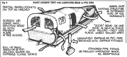 Fabric decks can be supported with beams that fit into sockets or notches in the gunwale or deck structure (Fig. 6). Sometimes these beams can be permanent and the fabric covering removed or left in place according to the weather. By laminating, you can make the beams to almost any shape for a small boat.