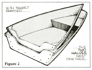 By using epoxy and plywood, it is possible to install back-to-back watertight bulkheads in a small hull, which, by removing a few fastenings, can be easily and quickly taken apart and reassembled. Bolted together, the bulkheads function as watertight dividers, and they stiffen and strengthen the hull. Unfastened, the sections can be carried or lifted more easily than a single hull, and they will fit into a smaller space. One section may even nest Inside the other.