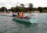A big smile, hard to do anything else if you have not rowed something like this before. Carbon fibre spoon blade oars, 17 ft waterline, and only about 70 lbs of weigh in the boat. Moves easily! |