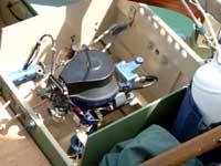 That little Houdini again, a small outboard motor with the leg shortened, the canopy discarded and the motor solid mounted as a “saildrive”. Anodised alloy parts, nice paint, and very tidy. A beautifully done conversion. |