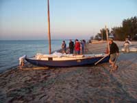 With some help from bystanders, we got Gary's Frolic2 off the trailer onto the sand, then we practiced moving it down the beach to the starting point - the high tide mark. |