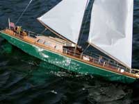What a delightful looking little schooner prototype (below) has emerged from the crowd at Fleetwood Model Yacht & Power Boat Club in England. I understand from Jim Bennett that their Fleetscale division are intent on establishing a Lady class (and that is nothing to do with women sailors) of boats on this 36” length overall hull from a mould made at Fleetwood. Eleven have either been built or were in the process of being built to sail or race as schooners or single masted cutters. I think that the prototype has absolutely beautiful lines, nice and flowing and with a hint of the past while retaining a simple rig. Not entirely disimiliar to the South Sea schooner Tiare Taporo the boat is refreshingly `different’ to the run of the mill schooners. One member of this club has built and sails the impressive Winston Churchill model seen below in the second photograph.