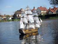Here’s another beautiful square-rigged model. Mark Tindall of Kent built and now sails this wonderful work of art, a 58” long model of Admiral Lord Nelson’s famous flagship, Victory. The model which is of course radio controlled, required 16lbs of ballast and has been modelled in her Trafalgar condition and the builder decided to show all the gunports open as though cleared for action. Depicted above and again below, there is an amazing tide of interest in square-riggers generally, in particular, fighting ships. Mark built the model in a year and a half period of time, having selected a size that would be relatively easy to both transport and lift into and out of sailing water.