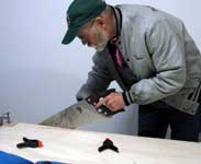 Another problem I encountered was fitting the spacer blocks to the heavy curvature. I didn't want to put excessive pressure on the hull panel and the outer rail by just applying massive clamping pressure to make the spacer block conform to the hull. To get around this, I placed "relief" cuts on the outer side of the spacer blocks; and this let them easily flex to fit the curve of the hull. I only had to do this at the #2-3-4-5 station lines. The other blocks glued up with no problems. I did change the block spacing in the plans drawings, from what I used on the prototype hull, after rethinking the spacing pattern. The new scheme is a better fit.