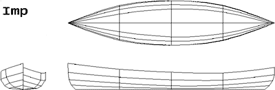 - Place an 11ft keelson along the moulds and fix it firmly in place using screws and small wedge-shaped chocks - you will need to be able to reach the screws to remove them when the time comes to liberate the hull from the moulds. Also fabricate and attach the stem and stern. I've found a really good way to do this is to mark out the shape on a piece of flat cheap material, such as more chipboard, and then to cut it out. I then cover it in polythene food wrap using masking tape. The next step is to cut and assemble pieces of my timber such that they covered the shape required with a little of the stem or stern material overlapping the template. Using 1 1/2 by 1 material, I managed to do both stem and stern for my prototype Imp in five pieces: three for the outer edge, one reinforcing piece on the inside, and one more to mate with the keelson. I then glue these together (using epoxy mixed with filler to make the glue) and clamp them. Once the glue has gone off, you can mark round the template and removed the excess on the stem and stern before glueing and screwing the stem and stern pieces to the keelson and to the strongback.