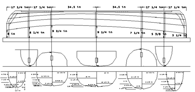 - Set up a strongback and moulds as shown in the drawing. The first three moulds are placed such that the distance from the stem to be is to their aft-most side, so that the material can be tapered using a batten so that it conforms to the curved strakes of the boat. The strong back should be made of fairly rigid material, but the moulds may be of something a little softer - the prototypes were built on chipboard moulds cannibalised from an unwanted wardrobe. A taught sting from one end of the strongback to the other should be used to line up (centre) the moulds - notch or otherwise construct the strongback or frames to allow this. Also, sight along the moulds and from the sides to make sure the moulds line up top and bottom, and do not lean fore and aft. Finally, cover the moulds with polyurethane food wrap, non-stick masking tape or whatever to prevent the hull becoming stuck down.