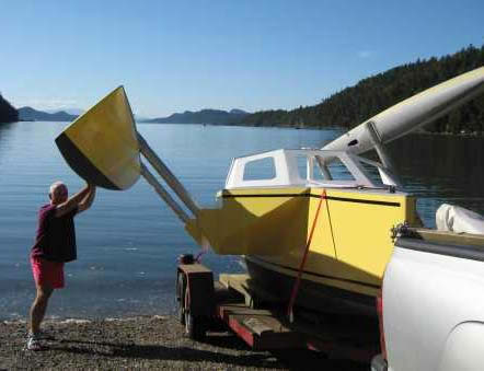 For trailering the outrigger hulls fold up. Because they are beach cat hulls they are very light (around 40kgs, under 100lbs) and so it is easy to do. The centre of gravity is still relatively low so no problems when driving. Trailering beam is under 8ft.
