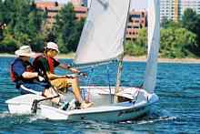 In a pickup race, I paired up with a keelboat sailor to race in a 420, which is a racing dinghy 420 centimeters long. He took the helm, and on the windward leg, sat down on the leeward side, intently peering around the jib as he steered. I climbed way up on the windward rail and still could not flatten the boat. I told him he could, ahem, come over to windward if he wanted to. He said he always steered from the lee side, because he could see better. I said, “I hope you can see better, because those boats you are looking at will be getting smaller!” Most boats sail best on their lines. In racing dinghies, you learn that it really matters where you sit. The first thing I heard about sailing the Thistle was, sit forward. You cannot sail the Thistle fast, in most conditions, without sitting so far forward that you can’t reach the tiller without the extension. In a big breeze, the Laser gets squirrelly if you sit too far forward on the downwind. We constantly move side to side to keep the racing dinghy flat.