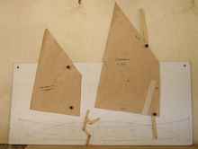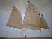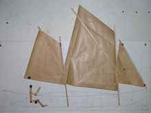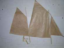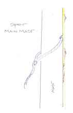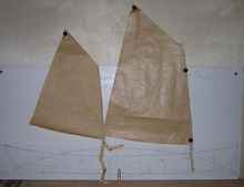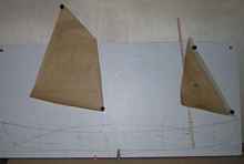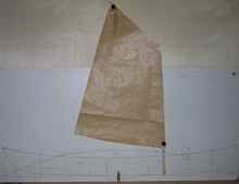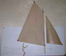 Between photo 2 and 5 there are small differences: the mizzen I made slightly smaller to move the CE forward, the peaks are slightly lower to bring the snotter within easier reach.
