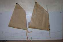 I then did the same process on the Catspaw: photos 23 and 24 show the shape of the final stages full and reefed. the peak outhaul is attached to a ring that encircles the sprit.