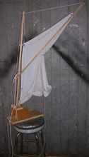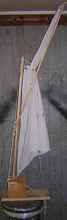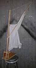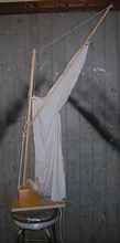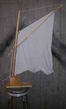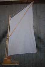 The next set of photos shows a 1/4 scale model to test the ideas. The sail is assumed to be in a track. Two other requirements are that the brailing line is attached to the sail and not to the mast, and that the sprit has a "spritstay" from the mast to keep it from capsizing. (The more historical method is to have a sort of halyard that attaches to the upper third of the sprit, holding it up independent of the sail. With the sprit freely supported like this and the sail in a track, the sail can be lowered and removed with the sprit standing.) The photos show the sequence of events in reefing.
