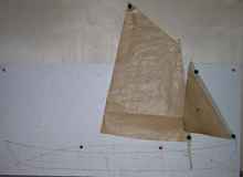 Would this long narrow hull allow effective sheeting of a loose footed main? Using the top down half hull view on the scale masonite drawing, I bent a batten to find the position of the the clew for the main and jib 10 degrees off the center line.