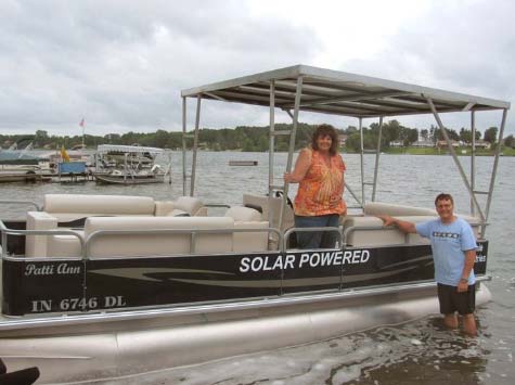 My brother Tim is a freelance aerospace engineer who lives on a small lake in Michigan. He recently applied his talents to a prototype that was also a birthday present for his wife: A solar powered pontoon boat. He gave me the following technical details: "It is a 48v system. 4kW motor, approx 1kw solar energy capture. 48v 200Ahr battery pack should run over 2 hours at max throttle. Approximately 10hr recharge time. It is mostly suited for small inland lakes like ours."