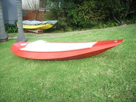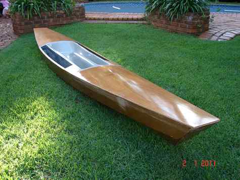 Briefly, she's 9' long, made from 4mm ply, f/g tape & epoxy. Finish is left-over water-based paint from the front door of our newly re-painted house, & she weighs only 17kg. The back-rest is my design.