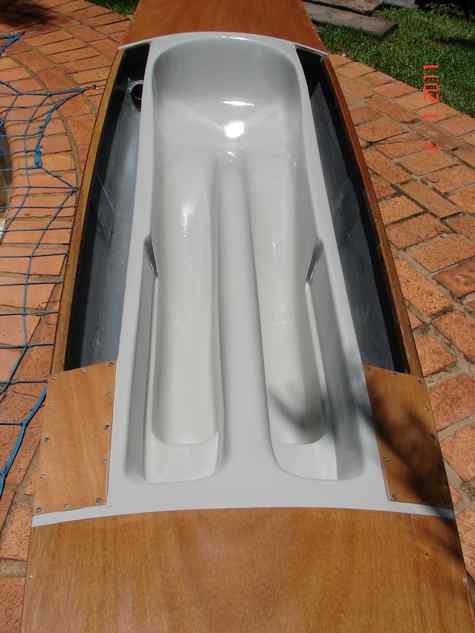 Anyhow, it is a fairly typical kayak hull, with the ends chopped of into transom-like bows and a reversed yacht style stern (because I could, that's why...) The cockpit is stolen from a racing surf-ski, and shoe-horned into the hull which is luckily good quality marine ply.
