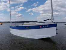 The picnic sail on Friday was a ripping great adventure for me and my Bolger Zephyr, the "Rampant Goose," a 20'3" long by 3'8" wide, lateen rigged, flat bottomed sharpie. (My family crest allegedly sports a rampant {in the heraldic sense} goose, standing on one webbed foot with the other leg raised and wings outstretched. I'm really not trying to masquerade as a mutant PDGoose!)