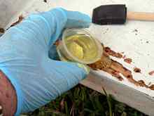 Next comes the epoxy. The goal is to saturate all of the affected wood right up to the good wood, which is why holes are drilled right up to and a little over the boundaries of the rotted areas. The epoxy is poured into the affected area, and a small brush spreads it and pushes it into any nooks and crannies. On the rubrail, some of the drilled holes were pretty deep, up to an inch or so. For those, a small syringe was used to inject epoxy into the affected areas. The rotted wood will soak up a lot of epoxy - a good thing. Several "injections" were needed on the rubrail. It is not necessary at this point to fill the affected areas with epoxy, but also don't scrimp. The goal is to saturate all the wood fibers in the affected area, from top to bottom, with resin.