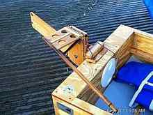 The hull modules above can be seen toward the front, with seat and rudder laying flat behind. The mast and boom are on the left side of the hull.