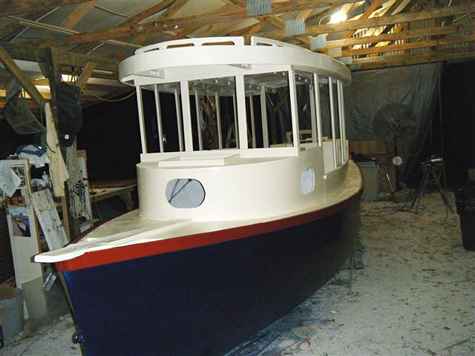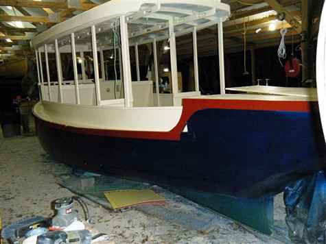 My Helen Marie is finally starting to look like a boat at last. These colors came out perfect for a boat of this vintage. When she gets all the windows and trim installed she'll really look great. I did use acrylic latex paint and it does shine. Actually this particular paint is called a marine coating and not paint. It's from Sherwin Williams and is pretty pricy, $100 a gallon. To get it to shine and have it come out really smooth I sprayed it on in several thin coats. Yes you can spray latex paint. In fact Harbor Freight sells a cheapo paint sprayer that's especially for latex, costs about twenty bucks, uses 50 psi max and does a good job once you figure it out. If you do this make sure you practice using water first and turn all of the adjustments to see what happens. Or you can just go straight to the real paint and get ready to do a lot of wiping off running paint. And clean up is easy, just rinse out the jar and fill it up with water, spray and shake the hell out of it and that's about it.