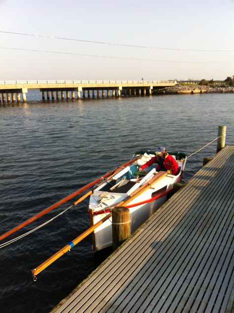 A couple of YouTube videos Chris's Sherpa sailing in very light air and him rowing it in no to little wind. We rowed together for a while and the speed of this capable boat is very good. After I took the rowing video, I handed him the oars to my Goat Island Skiff which where a little longer. He was able to increase his overall speed just a little with them.
