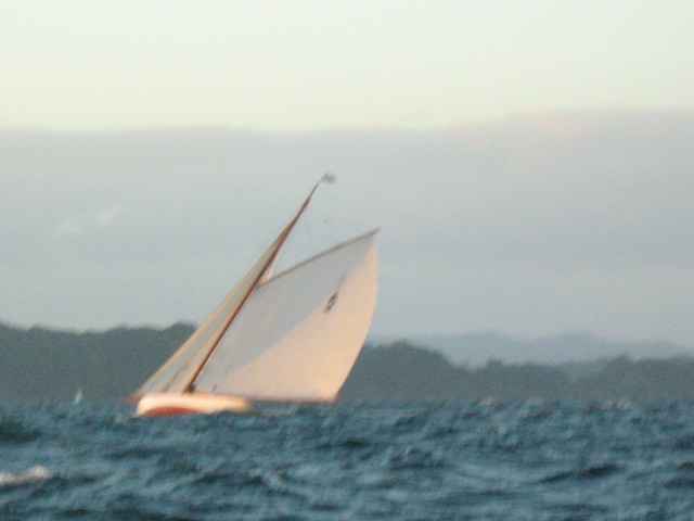 All lit up by the beginnings of a spectacularly colourful sunset. That’s the stern end of a 60 ft A class keeler going away from me at least three times my speed, she has two reefs in that huge mainsail and two small jibs up. Sorry about the blurry shot but I was being bounced around a lot as it was fair blowing. |
