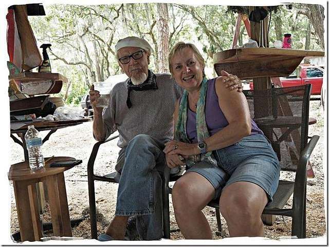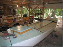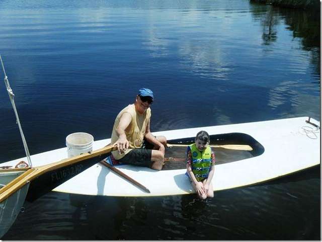 Someone was finally smart enough to buy the best 16 foot Melonseed ever built. This is the one with the foam hull that is indestructible. Here you see me and Laylah trying to sink it. It's mast was a little to fat so Fland's taking it down to the proper size, three inches at the bottom and two at the top. He's going to have so much fun with this one; I can see him surfing it in on Jacksonville Beach.