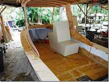 My fast commuter is not coming along worth a dam. After the first couple of week and the hull was done and deck started I was ripping right along. The cabin went on pretty fast but then I had to start painting; a screeching halt occurred. Water based paint WILL NOT dry when it 100% humidity, no way, no how. And epoxy does strange things also. You should see me out there with a hot air gun trying to get something to dry so I can get on with it. I can think Pat Johnson for the inspiration for his boat, he's a man who knows what he wants also.